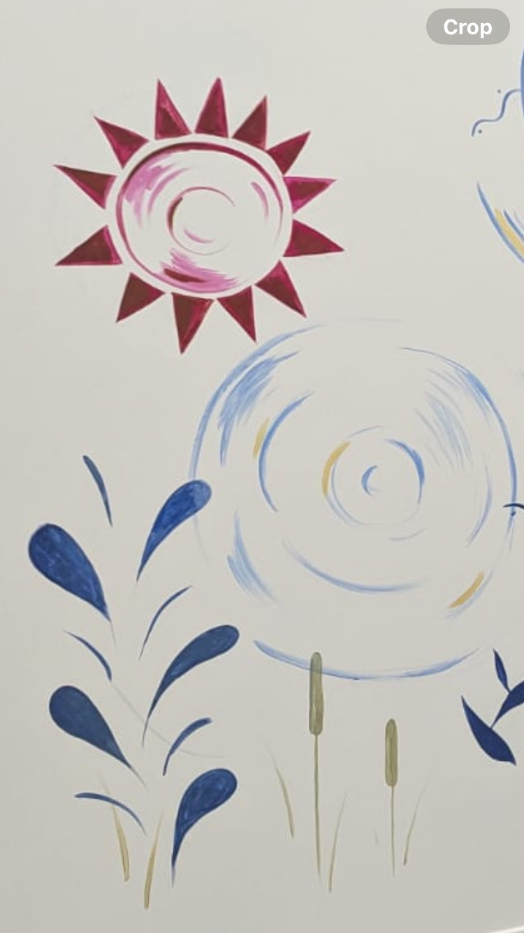 The walls were so pure white in a very concrete and grey environment so I was able to use any colour range I wanted. The mural shows circular forms in motion inspired by nature.